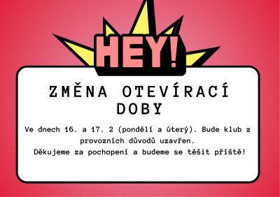 Ve dnech 16.-17.2. (pondělí, úterý) bude klub z provozních důvodů uzavřen. Děkujeme za pochopení a budeme se na vás těšit zase ve středu 18.2. :-)