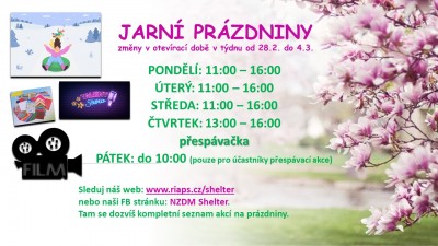 Startují jarní prázdniny a s nimi super akce! Těšit se můžete na přespávačku, bazárek oblečení, promítání a soutěž SHELTER HLEDÁ TALENT :-)